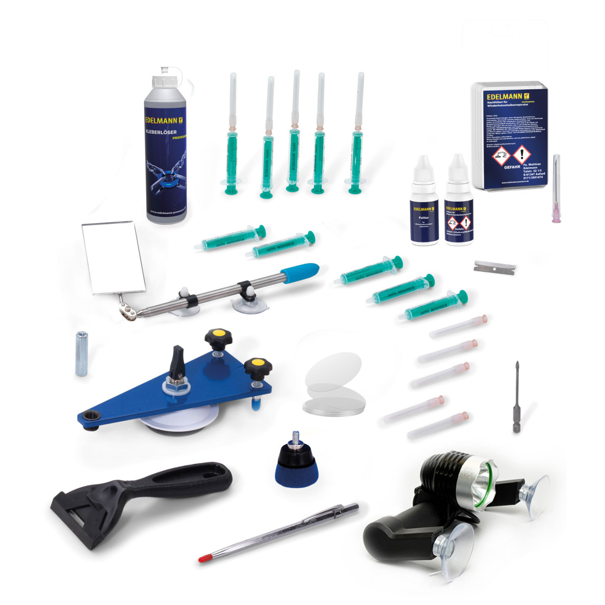 Alles was Sie zum reparieren von Steinschlägen benötigen ist in diesem Set enthalten.